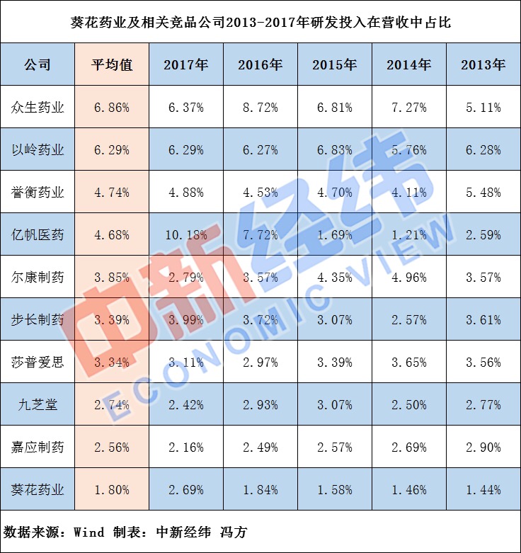 根据天眼查网站列出的葵花药业竞品企业信息,中新经纬客户端依序选出包括葵花药业在内的10家医药产品研发企业进行对比。上述10家企业2013-2017年研发投入在营收中占比数据显示,葵花药业的相应平均值处于最后一名。从各年数据来看,葵花药业2013-2016年研发投入在营收中占比均低于2%。其他9家中,仅亿帆医药这一数据曾低于2%。不过,亿帆医药2016与2017年研发投入在营收中占比则出现大幅提升。